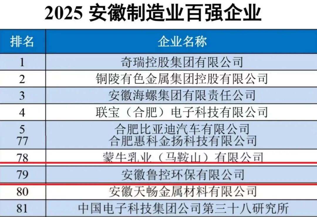 近日,“2025年安徽制造業(yè)百?gòu)?qiáng)企業(yè)”榜單正式揭曉,山東環(huán)保集團(tuán)權(quán)屬安徽魯控環(huán)保有限公司連續(xù)三年榜上有名。